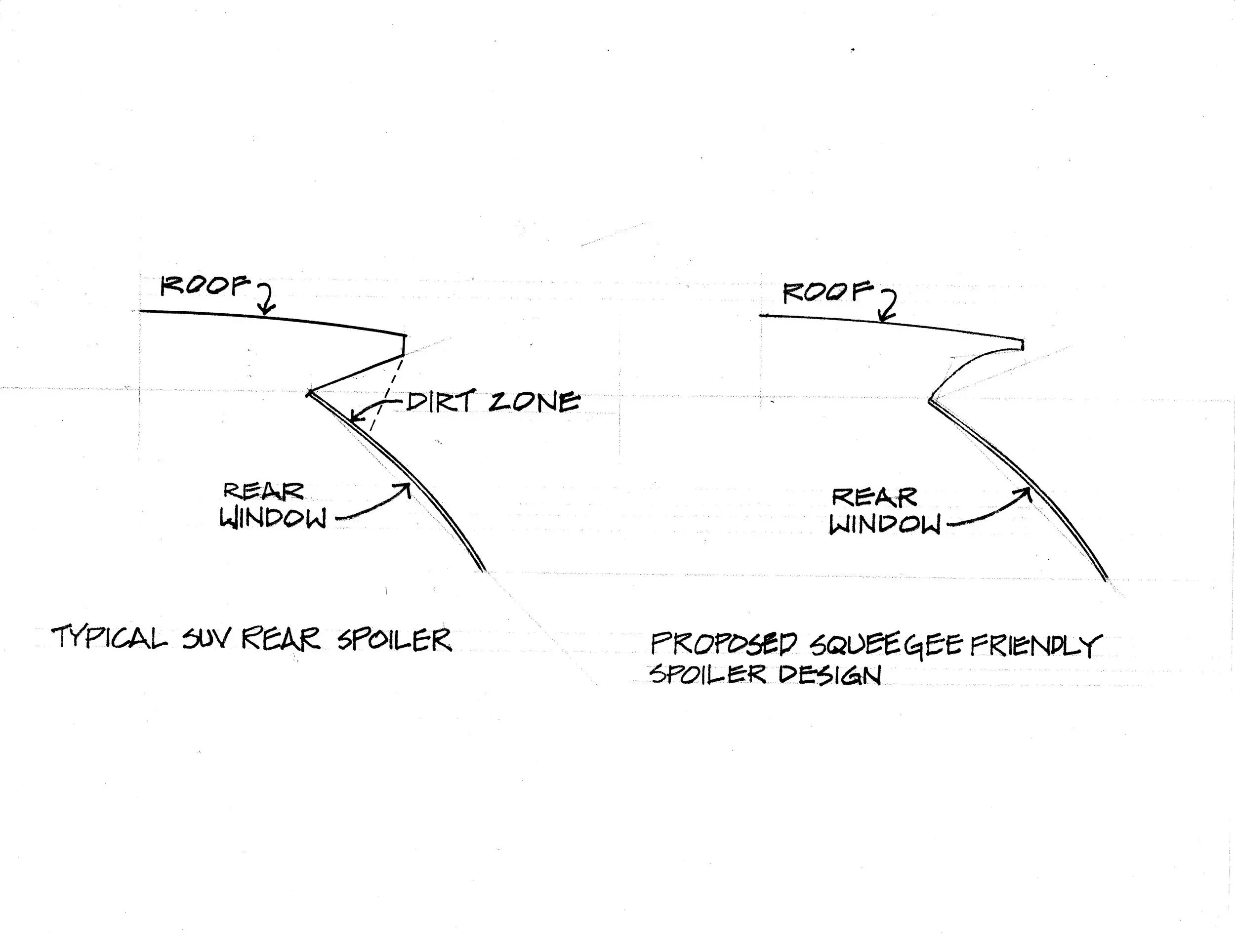 A simple proposed redesign of the lower surface of the rear spoiler is below, resulting in a squeegee friendly design. Here’s my request to SUV designers – look at your vehicles through the eyes of us consumers and design accordingly! As a note, I am available for consulting to correct this obvious design flaw.