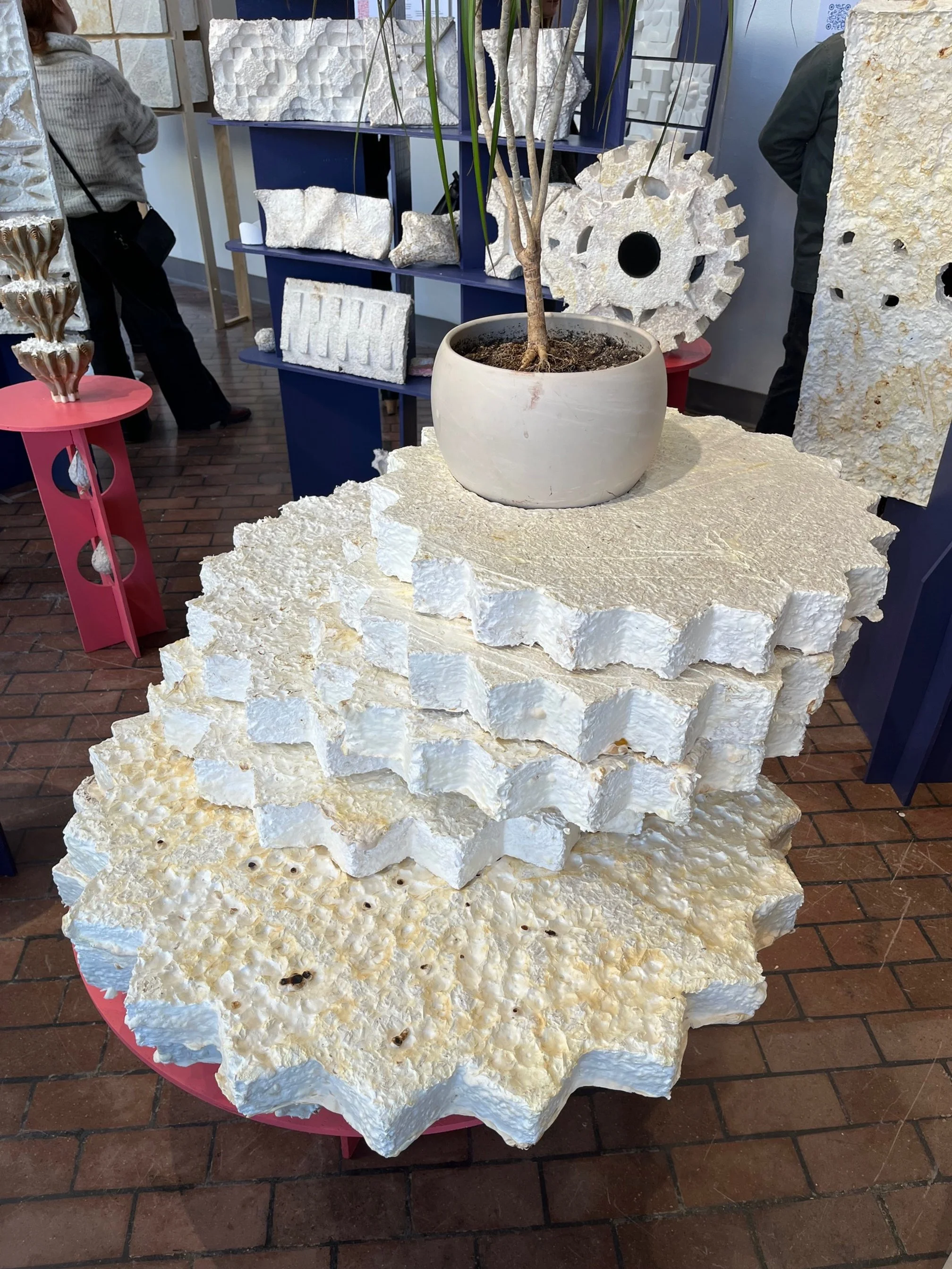This was my third adventure as a juror at Dr. Crawford’s class focused on creating structure with mycelium. It’s been fascinating to observe the progression over those three years as the first class focused largely on the mechanics of making simple blocks out of mycelium, while this class was able to progress to more symbolic and decorative uses of the basic material.