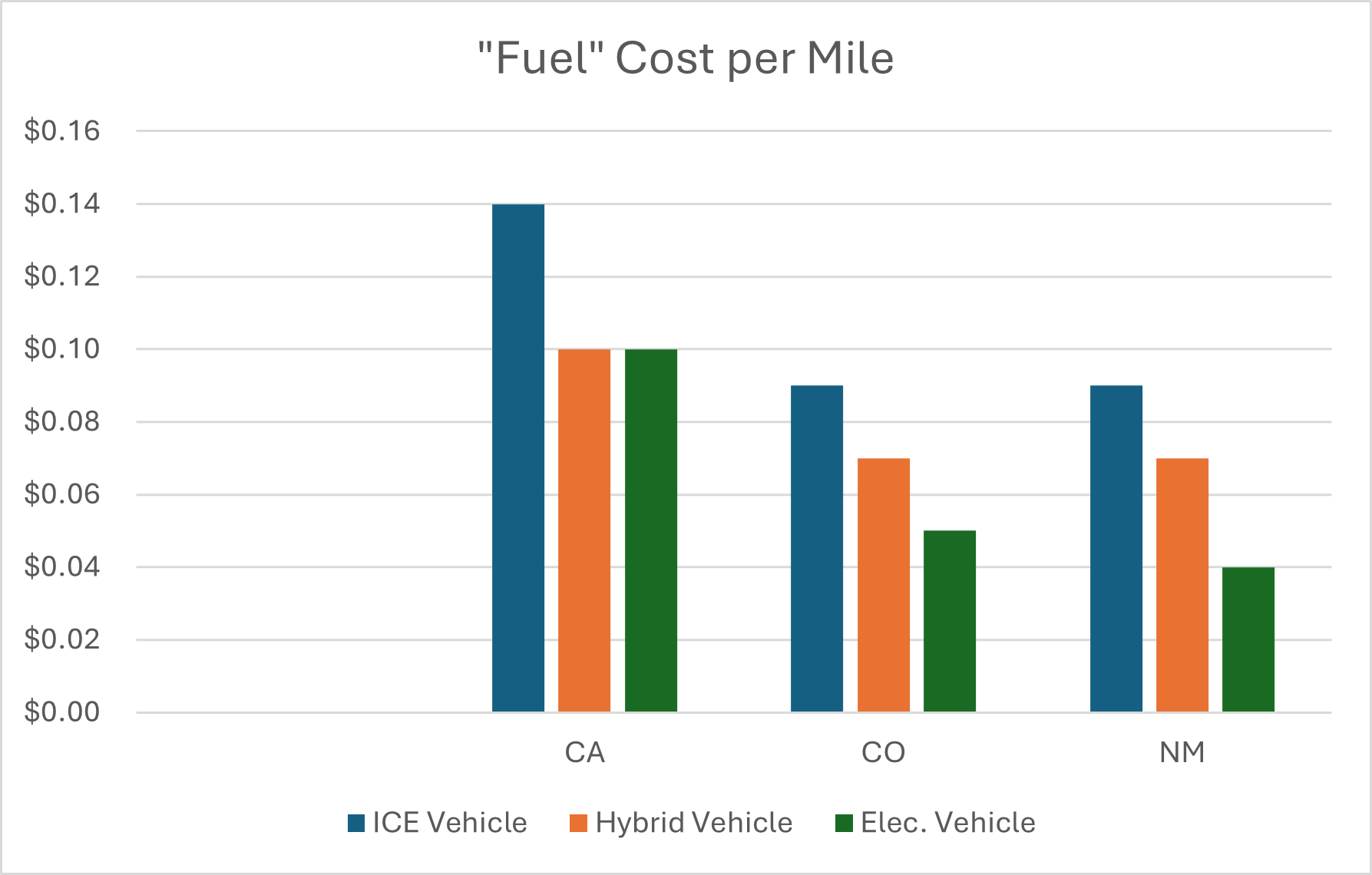 · Hybrid and EV vehicles have nearly identical “fuel” cost per mile in California, due to the very high price of gasoline there.