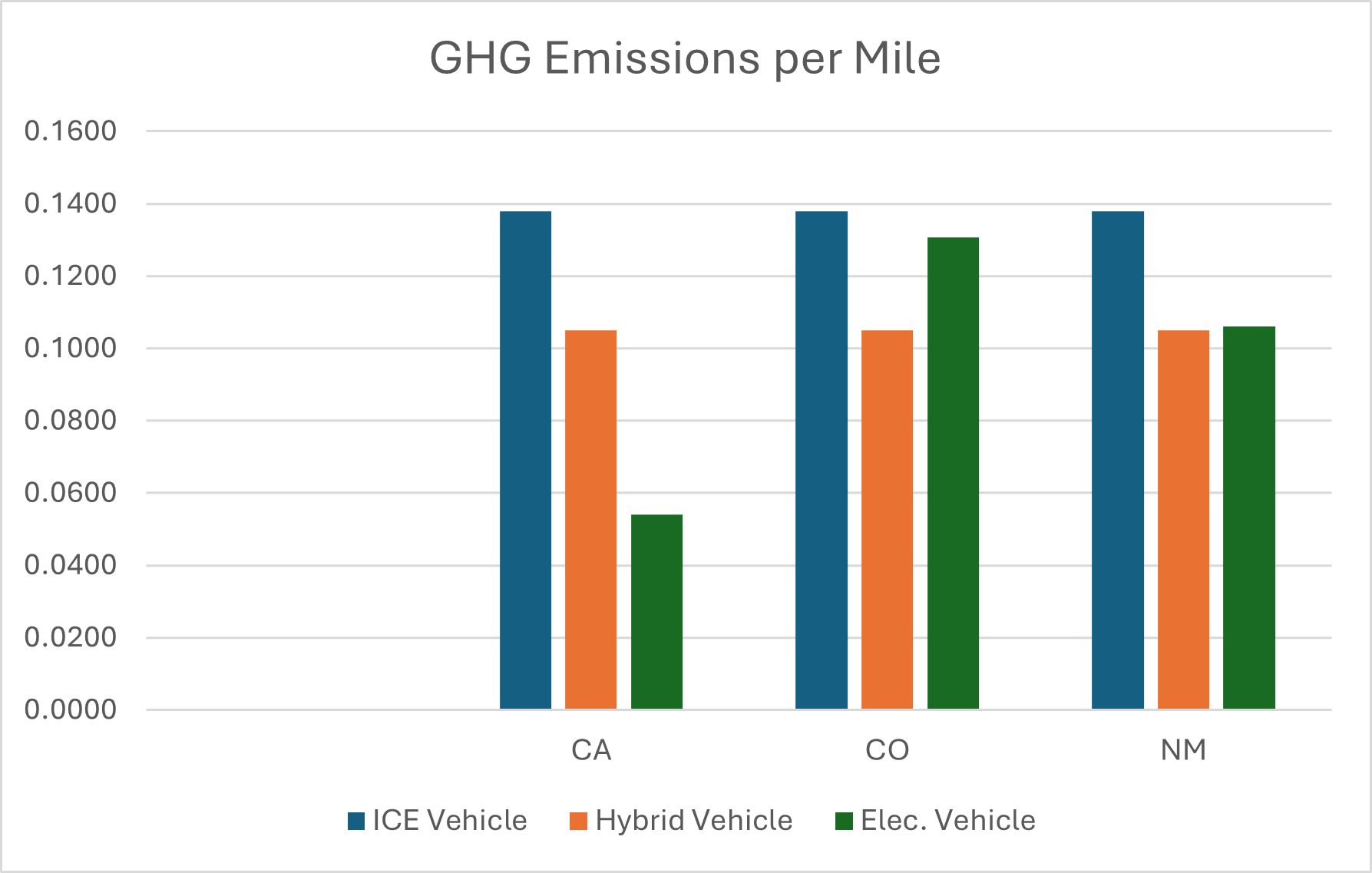 · EV’s have higher ghg emissions per mile in Colorado than Hybrid vehicles, and almost as much as ICE vehicles, due to the dirty grid in the central Rocky Mountain region.